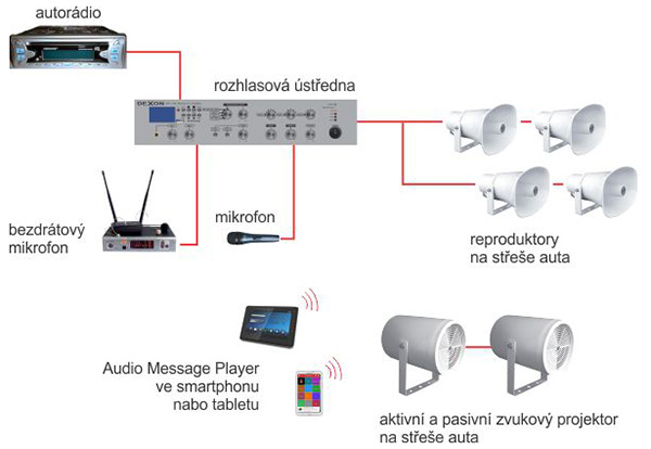Střešní ozvučení mítinkových automobilů politických stran, pojízdných prodejen, reklamních aut atd. je koncipováno na základě jednoduché 12V rozhlasové centrály. Dovoluje přímo přehrávat reklamní sdělení či jiná hlášení a hudbu z vestavěného Mp3 přehrávače nebo připojeného mikrofonu.