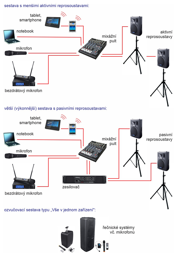 Pro menší akce, s menší ozvučovanou plochou, do 50 posluchačů a pro klidné prostředí, volíme jako reprosoustavy profesionální model BC 1000. Napojit je můžeme na zesilovač, viz dále. Výhodné je ale zakoupit hotovou sestavu s aktivními reprosoustavami, která obsahuje reprosoustavy mající zesilovač již zabudovaný v sobě, dále mixážní pult a dokonce i drátový a bezdrátový mikrofon.