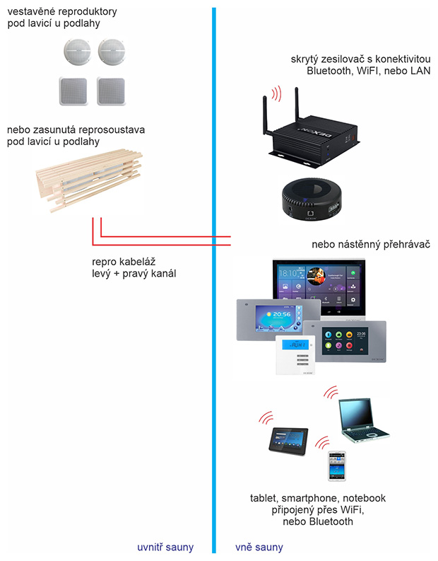 Mohli bychom vám doporučit připojení na stávající centrální audio systém v obývacím pokoji, ovšem je to nepraktické. Uživatelé chtějí mít ozvučení sauny obvykle oddělené. Existuje přelomová, do jisté míry, elegantní možnost ozvučení. Představte si, že vedle vypínačů na osvětlení instalujete další chytrou krabičku. Tou je tzv. nástěnný přehrávač se zesilovačem. Je to vlastně takové rádio pro saunu. Má v sobě přehrávač audia a videa, zesilovače, FM rádio nebo internetové rádio, většinou dotykový displej a hlavně spojení Bluetooth a na internet přes LAN kabel, nebo WiFi. Napájí se rovnou z 230 V a není potřeba žádný překážející adaptér. Předností nástěnných přehrávačů Dexon je jejich komfort a to, že v domácnosti nikde nic nepřekáží a hudba je vždy snadno dostupná, navíc i přes aplikaci v tabletu nebo smartphonu. Vše záleží na komfortu přehrávače, který si vyberete.