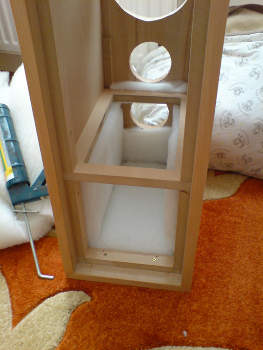 Celý korpus, kromě předního panelu, je vyroben z 19mm MDF desky s přírodní bukovou dýhou. Veškeré spoje jsou řádně podlepené a seřízlé na pokos. Uvnitř jsou dvě celoobvodové přepážky zvyšující celkovou tuhost ozvučnice. Na přední panel jsem použil bukovou spárovku a po okrajích zfrézoval hrany. Jediný odnímatelný díl je zadní panel, který je podtěsněný a řádně uchycený vruty. Vše ošetřeno bezbarvým lakem. Na vnitřní utlumení stojatého vlnění jsem použil tlumící rouno.