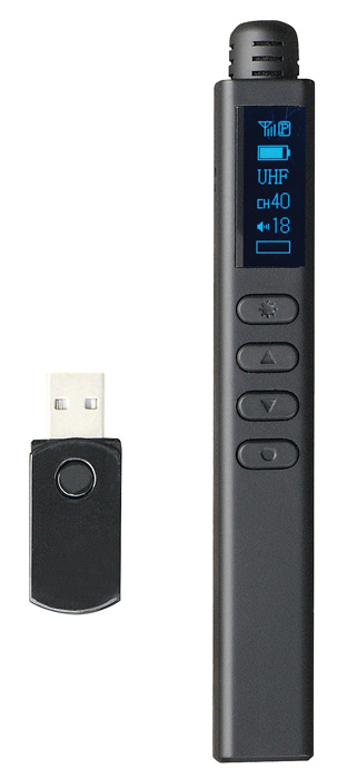 • digitální ruční multifunkční bezdrátový mikrofon má vestavěnou funkcí PPT (presentation page turn = stránkování prezentace), červené laserové ukazovátko a LCD displej