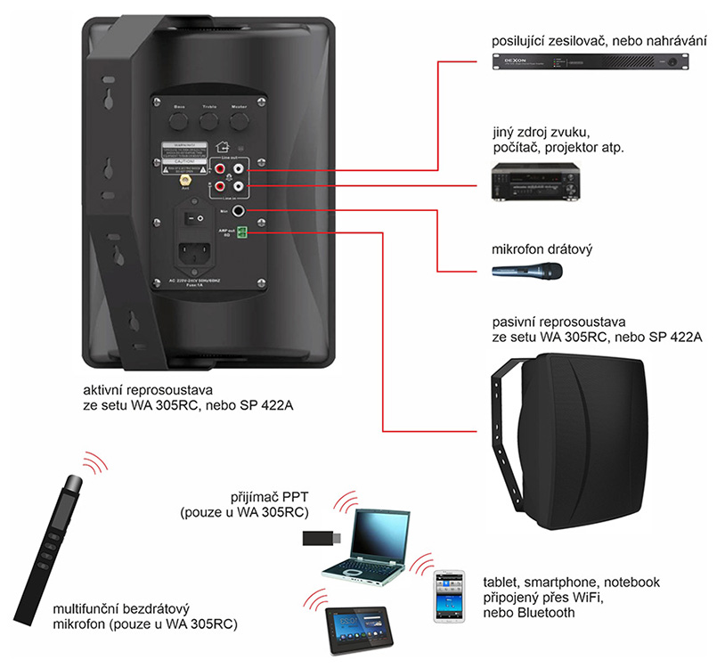 • WA 305RC je dodáván jako set aktivní a pasivní reprosoustavy, spolu s digitálním multifunkčním bezdrátovým mikrofonem a přijímačem PPT